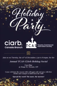 Past EventsTCAS2025-03-01T14:40:12-05:00 Notice of Annual General Meeting Read More TCAS – CIArb Canada Holiday Party Read More 2025 TCAS AGM & DINNER Read More CIArb/TCAS Summer Social Read More TCAS DINNER SERIES Read More TCAS Dinner Series Read More TCAS DINNER SERIES Read More TCAS/CIArb Annual Review of Canadian Arbitration Law Read More 2024 TCAS AGM & DINNER Read More First Annual Airing of Grievances Read More BROWN BAG LUNCH SERIES – ASK AN ARBITRATOR Read More TCAS SUMMER SOCIAL EVENT Read More TCAS 2023 Annual Conference and AGM Read More TCAS 2022 CONFERENCE and AGM Read More SAVE THE DATE! Read More Arbitration Year in Review Read More TCAS DINNER SERIES Read More CanArbWeek 2021 September 20-24, 2021 Read More 2021 TCAS AGM and Conference Read More TCAS WINE & CHEESE Read More Load More