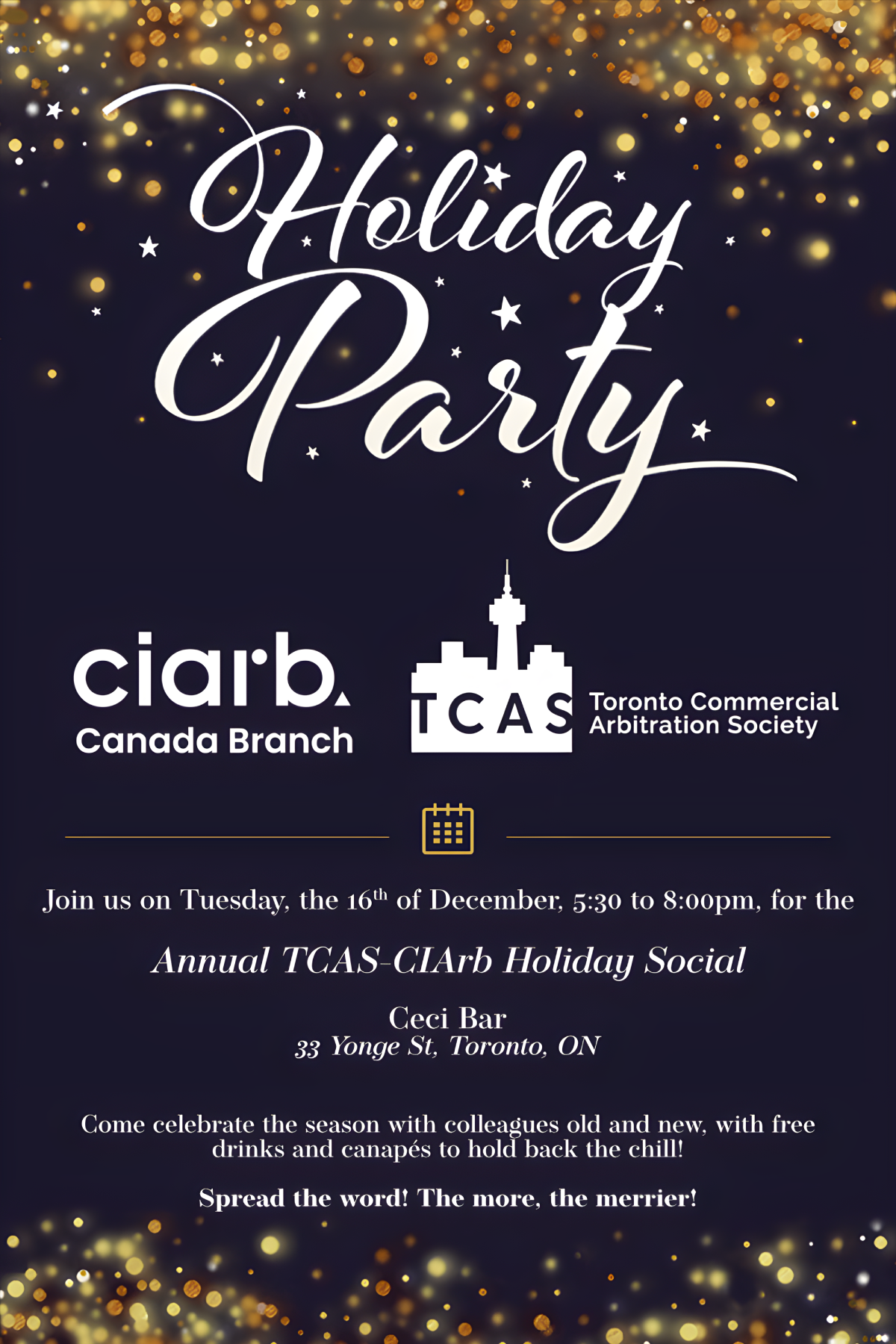 19Nov19 November 2025 TCAS – CIArb Canada Holiday Party TCAS2025-11-19T13:47:51-05:00 By TCAS Upcoming Events Yes, I’ll be there! Share this post Facebook Twitter LinkedIn Google + Email Author TCAS